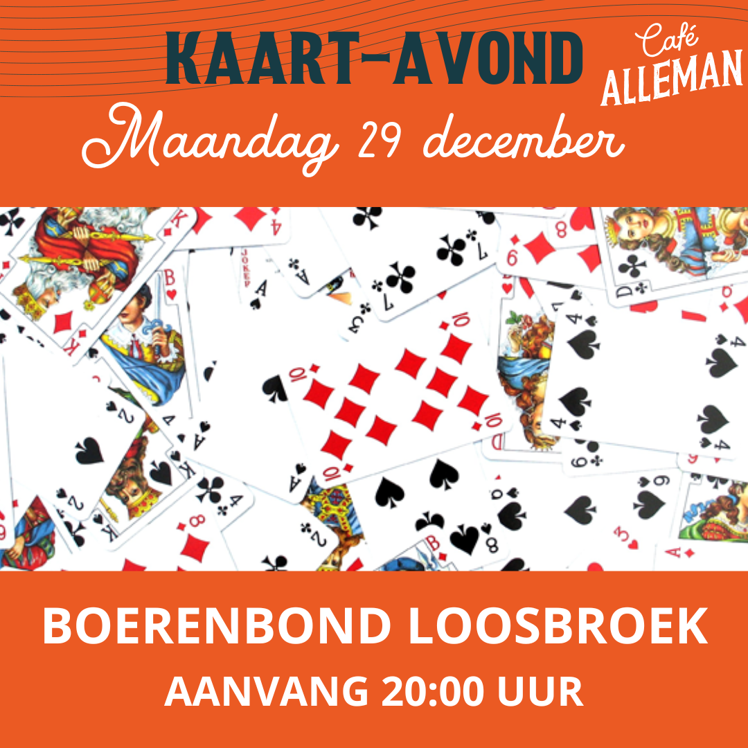 december 29 Kaartavond | Café Alleman | Boerenbond Loosbroek | Maandag | 20:00 uur Café Alleman Molenhoeven 45, Loosbroek, Netherlands